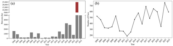 Annual trends in forest fire burned area and number of fires in South Korea from 2004 to 2023. (a) Annual burn area; (b) annual number of fires.