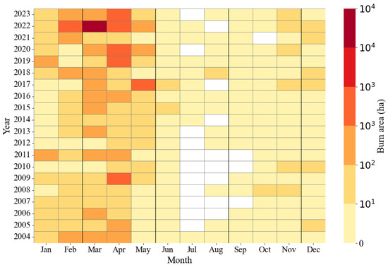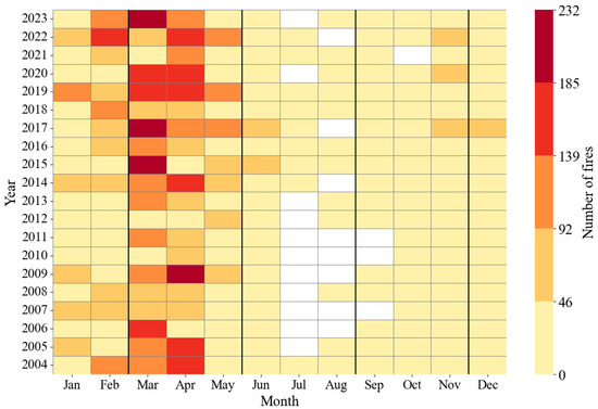 Two heatmaps depicting the monthly forest fire frequency and burned area from 2004 to 2023 revealed consistent seasonal patterns and interannual variability in fire activity across South Korea (Figure 4 and Figure 5).