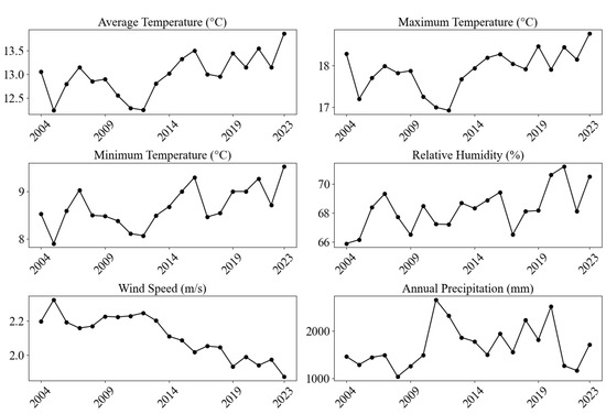The relative humidity exhibited a gradual increase over the study period. In contrast to the temperature and humidity, the wind speed showed a declining trend from 2004 to 2023.
