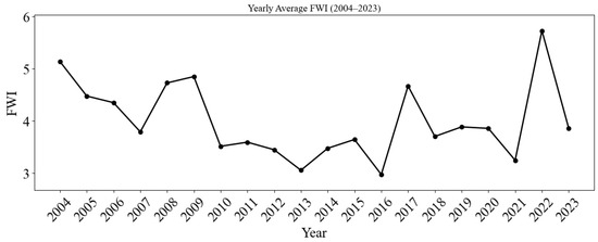 The annual average FWI from 2004 to 2023 demonstrated considerable interannual variability. Elevated FWI levels were observed in 2004, 2009, 2017, and particularly in 2022, whereas the 2010–2015 period showed comparatively lower values. Overall, the most recent decade demonstrated a general increase in FWI levels (Figure 8).