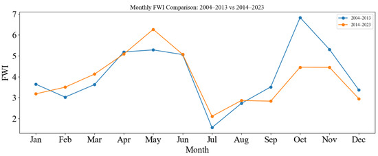Decadal comparison of monthly Fire Weather Index values (2004–2013 versus 2014–2023).