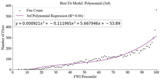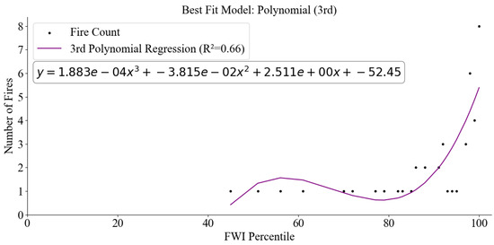 The FWI demonstrates a strong correlation with wildfire occurrence. An analysis of the wildfire counts across the FWI percentile bins revealed a sharp increase in the fire frequency with increasing FWI values. The polynomial regression model yielded a high R2 value of 0.86, underscoring the strong predictive capability of the FWI for wildfire ignition. These findings are consistent with those of previous studies that support the use of the FWI as an effective indicator of wildfire danger [40,41]. Moreover, it highlights the importance of adapting fire danger thresholds to regional conditions because the relationship between the FWI values and actual wildfire danger can vary geographically [3].