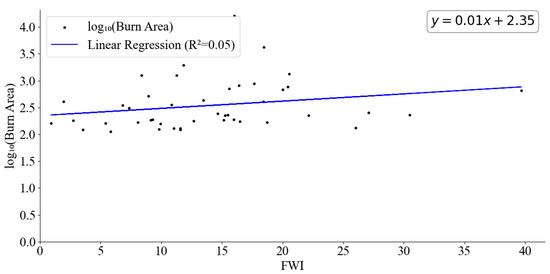 When comparing the FWI values to the burned area sizes of large fires, the log-transformed regression revealed only a modest upward trend. Although larger fires tended to be associated with higher FWI values, their explanatory power was limited (R2 = 0.05). This suggests that the FWI alone may not serve as a reliable predictor of the total burned area (Figure 12). Nevertheless, the positive slope indicated that larger burned areas were more likely to be present under heightened fire weather conditions, albeit less directly than that of the fire frequency.