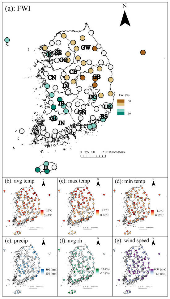 Spatial distribution of decadal changes in the Fire Weather Index (FWI) and key meteorological variables across South Korea. (a) FWI percentage changes for the 2004–2013 and 2014–2023 periods. (b–d) Increases in average, maximum, and minimum temperatures (°C). Changes in (e) precipitation (mm), (f) relative humidity (%), and (g) wind speed (m/s). (BS: Busan, CB: Chungcheongbuk-do, CN: Chungcheongnam-do, DG: Daegu, DJ: Daejeon, GB: Gyeongsangbuk-do, GG: Gyeonggi-do, GJ: Gwangju, GN: Gyeongsangnam-do, GW: Gangwon State, IC: Incheon, JB: Jeollabuk-do, JJ: Jeju, JN: Jeollanam-do, SE: Seoul, US: Ulsan).