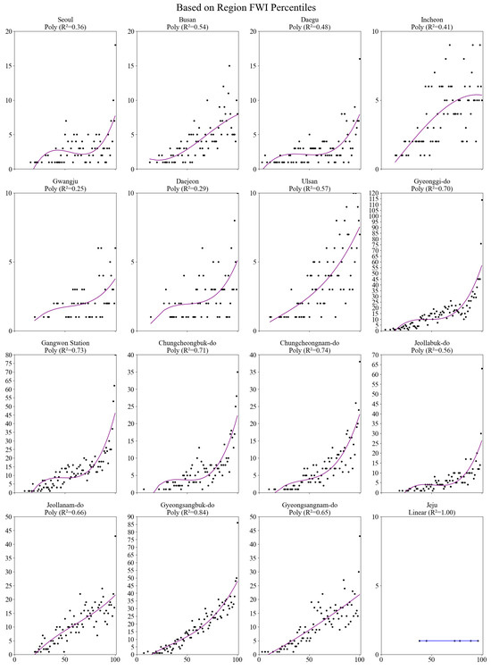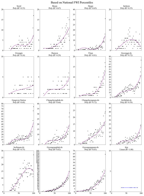 When using the common FWI percentiles calculated from all stations, several regions, including Ulsan, Gyeongsangbuk-do, and Gyeongsangnam-do, exhibited particularly strong correlations, with an R2 value exceeding 0.8 (Figure 14). However, when the FWI percentiles were adjusted individually for each region, only Gyeongsangbuk-do maintained an R2 above 0.8. Despite this difference, most regions still demonstrated an increasing trend in wildfire frequency corresponding to the rise in FWI percentiles (Figure 15).