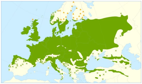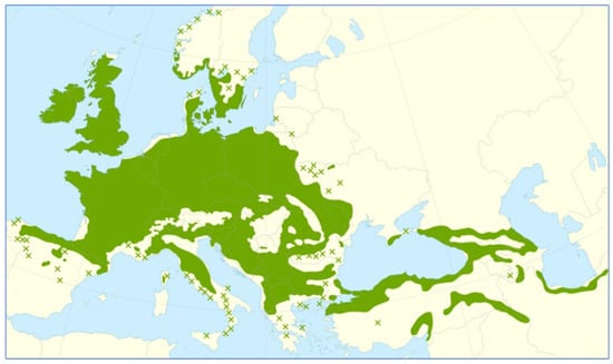 Distribution map of Quercus petraea (sessile oak) across Europe. Dark green areas indicate the native continuous range, while X symbols represent native isolated populations [].