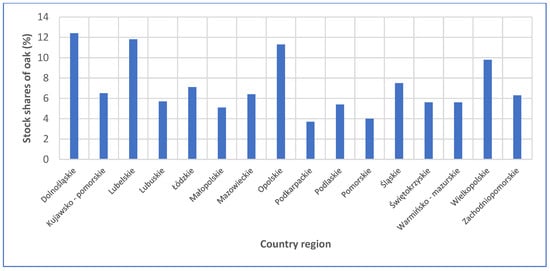 Stock shares of standing oak timber in Poland, in % of total timber by region (2023) [].