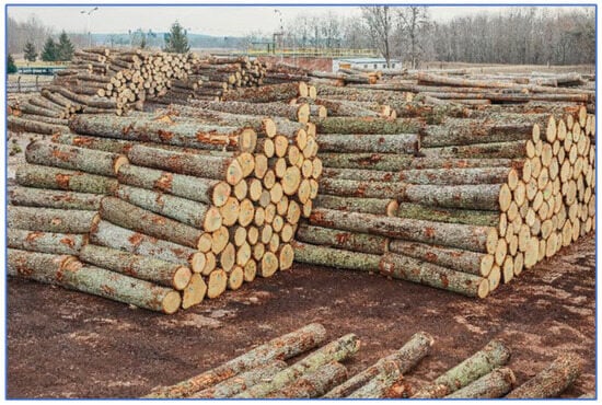 While biotic factors—such as fungi, bacteria, and insects—play a key role in wood discoloration through natural degradation, production-driven abiotic factors, though not previously addressed, also contribute significantly to unwanted color changes, particularly during the early stages of storage and processing. One important aspect to consider is the impact of secondary processes on wood color, especially those occurring in the logyard environment []. Tarotinsky [] drew attention to the formation of sun stains—discolorations that develop when veneer oak logs are left unprotected or insufficiently shielded from environmental exposure. These stains, which became more pronounced from June to September, penetrated up to 50–100 mm into the wood from the log’s end surface. To reduce such effects, he emphasized the importance of proper log storage and efficient use of raw materials. Malaszewski [] further recommended processing oak wood during the winter–spring period (up to the end of May) and, afterward, switching to species less sensitive to weathering. In response, modern production practices have evolved to minimize sun-related staining. These include winter felling, tight log stacking to reduce light and heat exposure, orienting logs away from direct sun, and sprinkling logs with water to cool them and stabilize temperature in the raw material yard (Figure 5). The image shows logs stacked tightly in a timber yard—a simple but effective practice widely used to protect wood from early discoloration, especially sun stains. When logs are arranged in dense, compact piles like this, much of their surface is shielded from direct sunlight, air movement, and temperature extremes. This helps reduce the risk of uneven drying, cracking, and surface staining caused by prolonged exposure to heat and light.