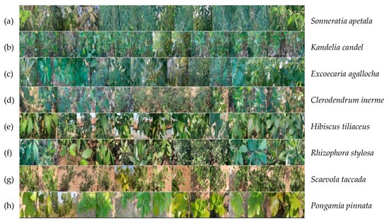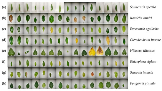 Two datasets of mangrove family plant leaves were used: one collected in a controlled experimental environment and the other in a real-world setting. The experimental dataset consists of leaf images independently photographed and compiled by our laboratory for deep learning purposes, using a Canon 5D Mark IV camera. It includes leaves from eight mangrove species: Sonneratia apetala, Kandelia candel, Excoecaria agallocha, Clerodendrum inerme, Hibiscus tiliaceus, Rhizophora stylosa, Scaevola taccada, and Pongamia pinnata (as shown in Figure 1). The dataset contains a total of 4000 images, with approximately 500 samples per species. These images are divided into a training set (2400 images), a validation set (800 images), and a test set (800 images), all resized to a uniform resolution of 224 × 224 pixels.