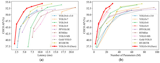 YOLOv10 compared to nine alternative trained models [25]: (a) training latency graph; (b) parameter comparison graph.