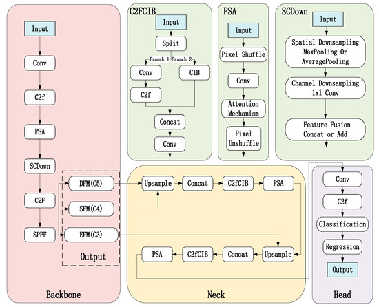The SCDown module employs strided convolution or pooling operations to reduce spatial resolution, outputting a feature map of size . A 1 × 1 convolution is then used to decrease the number of channels, producing a feature map of size . Ultimately, the results of spatial downsampling and channel downsampling are fused, yielding an output feature map of size .