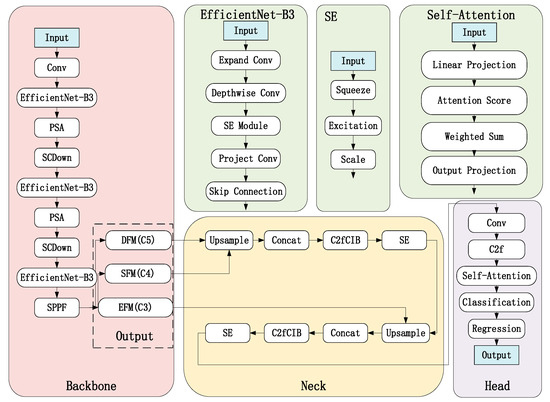 The original CSPDarknet53 was replaced with EfficientNet-B3 to enhance feature extraction efficiency. As shown in Figure 6, compound scaling is employed to balance depth, width, and resolution, enabling richer feature extraction under limited computational resources—particularly suitable for capturing subtle variations in leaf texture and color. A PSA module was added after each stage to strengthen attention to leaf textures and shapes. Through pixel shuffling and attention mechanisms, it enhances focus on local leaf details (e.g., veins, edges), improving discrimination between similar leaves. The SCDown module was incorporated to reduce resolution while preserving leaf detail information. These modifications collectively enhance feature extraction capability while maintaining detailed information, making the network particularly effective for handling similar leaf morphology and recognition in complex backgrounds.
