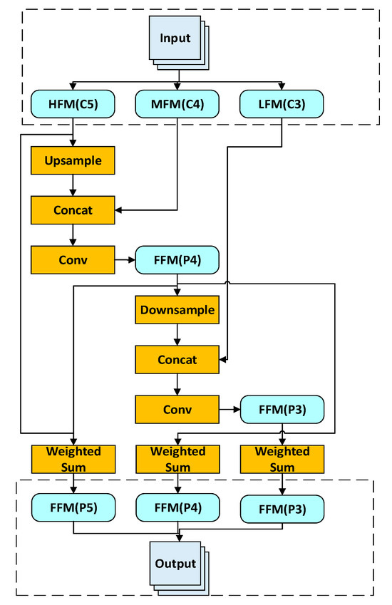 - Finally, the fused feature maps undergo weighted summation to generate the final multi-scale feature maps (P3, P4, P5).
