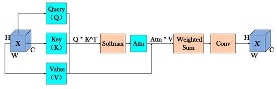 The Self-Attention module enhances focus on key leaf regions by dynamically adjusting feature weights through calculating spatial relationships within the feature map. Specifically, the input features are first projected into Query (Q), Key (K), and Value (V) representations using 1 × 1 convolutions, where Q and K are used to compute attention weights via dot product operations, followed by Softmax normalization to obtain the final attention distribution. These attention weights are then applied to V through weighted summation to generate context-aware features. Finally, another 1 × 1 convolution projects these weighted features to restore the original channel dimensions, producing the output feature map with enhanced discriminative power for leaf analysis (as illustrated in Figure 8). This attention mechanism enables the model to adaptively emphasize morphologically significant regions while suppressing irrelevant background information.