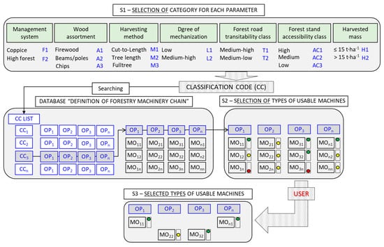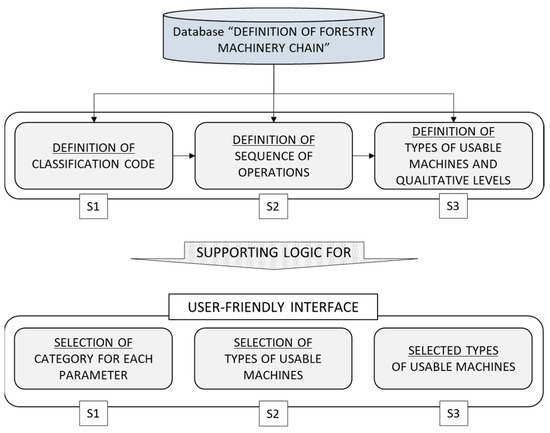 Step 3 represents the final output of M1, which shows the sequence of the OPs that compose the selected FMC and, for each of them, the selected types of usable machines with the corresponding qualitative levels. By clicking on the “reset” button, the sequence of OPs and the corresponding machine types are deleted, and the user can make a new selection. The user can select any type of machine among those proposed by the model, even a type characterized by a low qualitative level, as the selection is based on real machine availability at the logging company. The logical framework of the User-Friendly-Interface spreadsheet is shown in Figure 3.