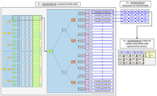 Simplified scheme of the relationships between Steps 1 and 3 in M1. The sequence of the operations and the types of usable machines (with the qualitative levels) are defined for all generated CCs. For space reasons, the scheme has been structured starting from code F1A1M1 (black-framed box in the first image on the left). The same logic is repeated for F1A1M2, F1A1M3, and so on. Overall, the model generates 432 combinations, corresponding to 192 unique classification codes (i.e., 192 applicable FMCs). Legend: S, step; OP, operation; MO, potentially usable machine type.