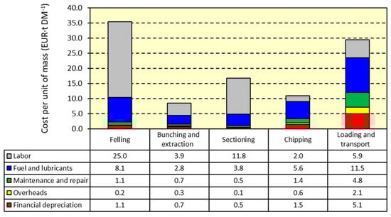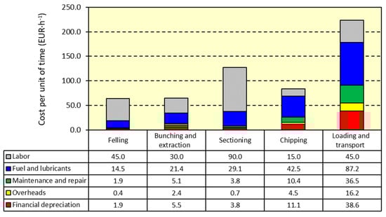 The results indicated that felling was characterized by the lowest cost per unit of time (63.7 EUR·h−1) but the highest per unit of mass (35.4 EUR·t DM−1). This is essentially because the required working time of this OP is the highest compared with the other OPs, but its productivity is the lowest (33.3 h and 1.8 t·h−1 DM, respectively).