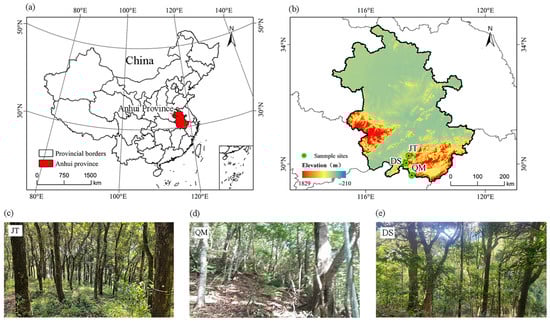 Study area in Anhui Province, China: (a,b) Location of sample sites in China; (c) overview of the 46-year-old forest; (d) overview of the 78-year-old forest; (e) overview of the 200-year-old forest. Jitan Township: JT; Qimen County: QM; Dashan Village: DS.