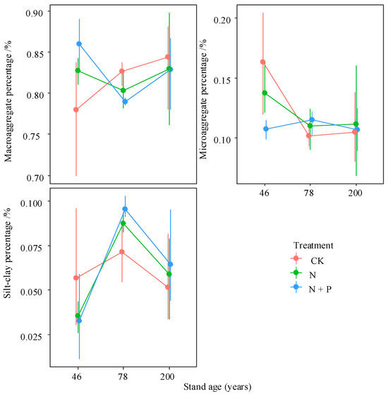 The proportion of macroaggregates increased with the increased forest age, while the proportion of microaggregates significantly decreased (p < 0.05) from the 46- to 78-year-old stands, with fewer changes between the 78- and 200-year-old stands, and the proportion of silt–clay fractions in the 78-year-old stands was more than that in the 46- and 200-year-old ones. N addition increased the proportion of macroaggregates in the 46-year-old stands but decreased it in the 78- and 200-year-old stands; however, the proportion of microaggregates and silty–clay particles changed in the opposite direction (Figure 2).