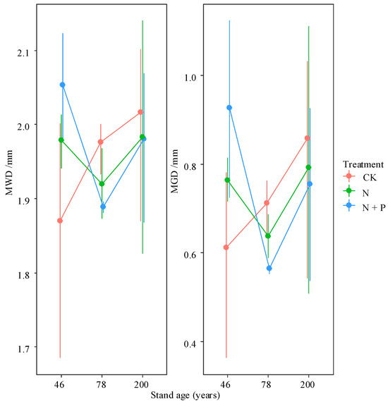 Interactive effects of treatment and stand age on MWD and MGD. Treatments are the control (CK), nitrogen addition (N), and N and phosphorus addition (N + P). Values are bootstrapped means ± 95% confidence intervals (CIs) for individual samples and their sum. Differences among time since closure classes or soil depths are significant at p = 0.05 if their confidence intervals do not overlap each other’s means.