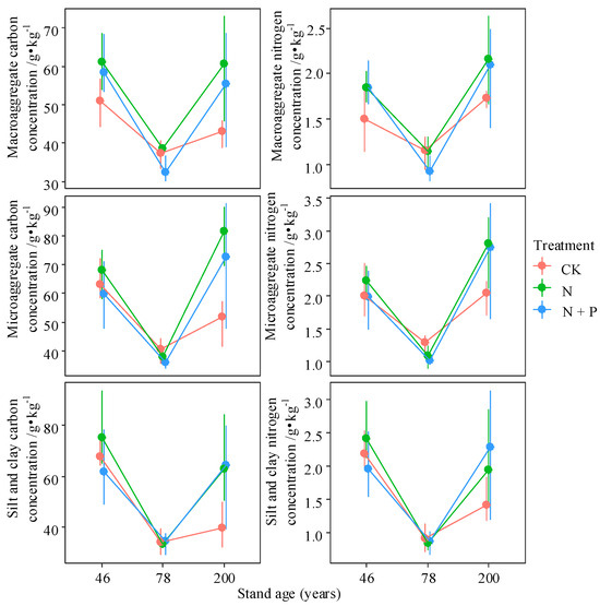 Interactive effects of treatment and stand age on C and N concentration of different aggregates. Treatments include control (CK), nitrogen addition (N), and combined N and P addition (N + P). Data are presented as bootstrapped means ± 95% confidence intervals for individual aggregate fractions and their total. Differences among time since closure classes or soil depths are significant at p = 0.05 if their confidence intervals do not overlap each other’s means.