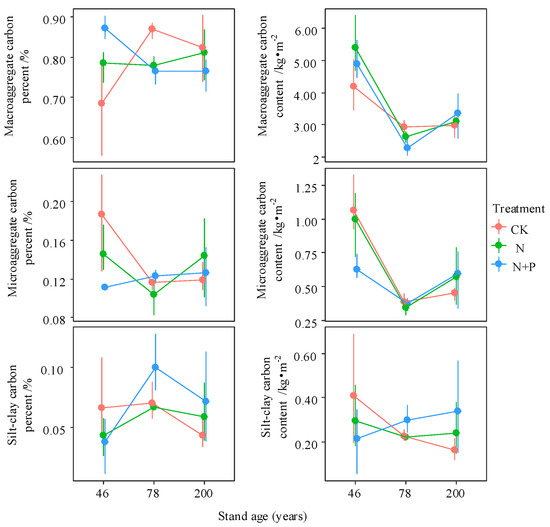 Interactive effects of treatment and stand age on carbon content and mass proportion across different soil aggregate fractions. Treatments include control (CK), nitrogen addition (N), and combined nitrogen and phosphorus addition (N + P). Data are presented as bootstrapped means ± 95% confidence intervals for each aggregate fraction and their total. Differences among time since closure classes or soil depths are significant at p = 0.05 if their confidence intervals do not overlap each other’s means.