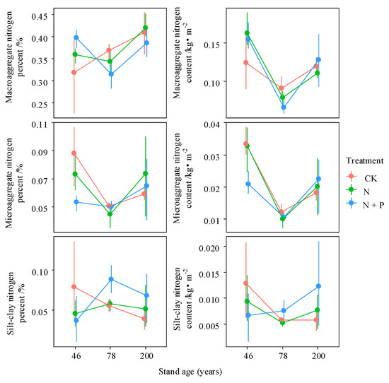 Interactive effects of treatment and stand age on nitrogen content and mass proportion across aggregate size classes. Treatments include control (CK), nitrogen addition (N), and combined nitrogen and phosphorus addition (N + P). Data are presented as bootstrapped means ± 95% confidence intervals for individual aggregate fractions and their total. Differences among time since closure classes or soil depths are significant at p = 0.05 if their confidence intervals do not overlap each other’s means.
