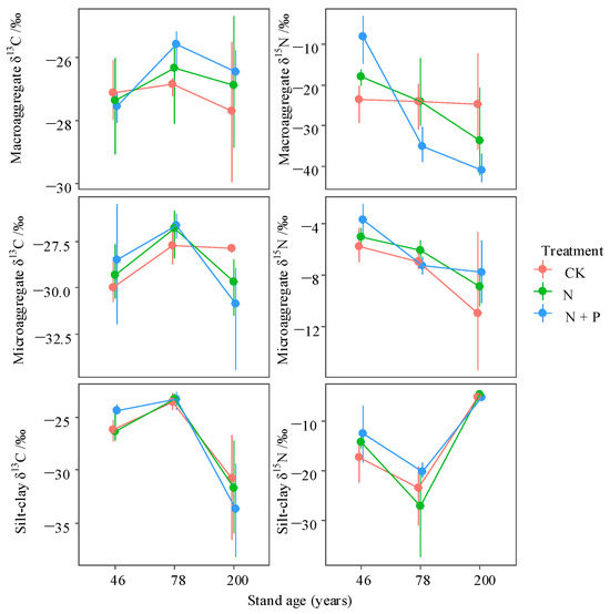 Interactive effects of treatment and stand age on the δ13C and δ15N abundances in different soil aggregate fractions. Treatments include control (CK), nitrogen addition (N), and combined nitrogen and phosphorus addition (N + P). Data are presented as bootstrapped means ± 95% confidence intervals for individual aggregate fractions and their total. Differences among time since closure classes or soil depths are significant at p = 0.05 if their confidence intervals do not overlap each other’s means.
