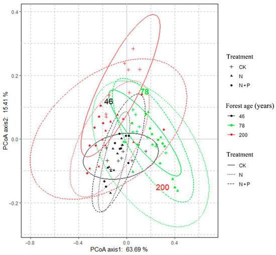In the CK, the soil δ13C levels were higher than those in macroaggregates (p > 0.05). In contrast, the δ15N levels were lower in the CK (Figure 7 and Figure S2; p < 0.05). Among the macroaggregates, the δ13C values were highest in the 78-year-old and lowest in the 200-year-old stand. N addition led to an increase in the macroaggregate δ13C in both the 78-year-old and 200-year-old stands, while it caused a decrease in the 46-year-old stand (p > 0.05). Additionally, N addition significantly increased the microaggregate δ13C in the 46- and 78-year-old samples (p > 0.05). For δ15N, N addition notably increased the levels of macroaggregates from the 46-year-old stand (p < 0.05) but decreased these levels in the 200-year-old stand (p > 0.05). The results of the PCoA of the aggregate fractions and stable isotopes showed a clear separation between the CKs of different ages. However, there was no significant separation between CK and N addition across the different-aged stands (Figure 8).