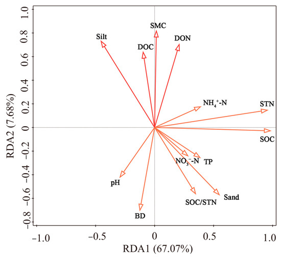In each plot, the litter layer was carefully removed prior to soil sampling. Fresh soil samples were collected from a depth of 0–10 cm using a 5.0 cm diameter soil corer, employing a five-point sampling strategy. All samples were promptly transported to the laboratory for processing and analysis in late July 2018. A portion of each sample was passed through a 5 mm sieve to isolate water-stable aggregates, while the remaining portion was sieved through a 2 mm mesh, thoroughly homogenized, and used for various soil analyses. Soil bulk density (BD), moisture content, ammonium nitrogen (NH4+-N), nitrate nitrogen (NO3−-N), dissolved organic carbon (DOC), dissolved organic nitrogen (DON), SOC, STN, pH, and total phosphorus (TP) were obtained from concurrent experiments, as previously published [39]. Additionally, soil texture was determined using the particle size classification method described in the literature [40].