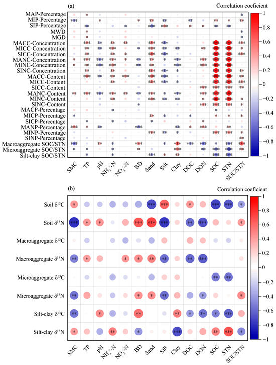 Correlation analysis of aggregate fractions (a), stable isotopes (b), and environmental factors. Macroaggregate percentage: MAP-Percentage; microaggregate percentage: MIP-Percentage; silt–clay percentage: SIP-Percentage; macroaggregate carbon concentration: MACC-Concentration; microaggregate carbon concentration: MICC-Concentration; silt–clay carbon concentration: SICC-Concentration; macroaggregate nitrogen concentration: MANC-Concentration; microaggregate nitrogen concentration: MINC-Concentration; silt–clay nitrogen concentration: SINC-Concentration; macroaggregate carbon content: MACC-Content; microaggregate carbon content: MICC-Content; silt–clay carbon content: SICC-Content; macroaggregate nitrogen content: MANC-Content; microaggregate nitrogen content: MINC-Content; silt–clay nitrogen content: SINC-Content; mean weight diameter: MWD; geometric mean diameter: GMD; soil moisture content: SMC; soil sand content: Sand; soil silt content: Silt; soil clay content: Clay. *: p < 0.05; **: p < 0.01; ***: p < 0.001.