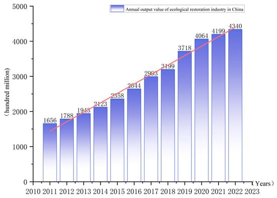 China’s ecological protection and restoration industry presents substantial growth potential. Since 2015, China’s investment in environmental protection and governance as a percentage of GDP has steadily risen. However, this remains below the over 2.5 percent GDP benchmark typical of Western economies. According to statistics, China’s ecological restoration market has expanded annually, growing from approximately CNY 165.6 billion in 2011 to CNY 434 billion in 2022 [20,21]. As illustrated in Figure 1, the Chinese ecological restoration industry has maintained an annual growth rate exceeding 10% in recent years. The total investment has reached more than twice that of 2011. Given the escalation of the environmental challenges from climate change, air pollution, and sustainable land management, the robust expansion rate is expected to accelerate further. Under current trends, the market size could surpass CNY 700 billion by 2024 [22]. The year-on-year expansion thereby provides a solid basis for advancing market-oriented ecological restoration initiatives.