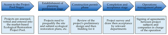 During the introduction of the ecological restoration market, the approval process of ecological restoration projects plays a crucial role [47]. Therefore, the establishment of a reasonable and efficient “whole life cycle” approval process and rules can assist ecological restoration market-oriented projects in terms of laws and regulations, the approval process, and rules. The establishment of a reasonable and efficient “whole life cycle” approval process and rules can offer a reference for a series of issues arising from laws and regulations, institutional norms, and after-sale monitoring of ecological restoration projects [48]. It is a procedure that regulates and guides ecological restoration projects, covering the entire process of project entry, project design, construction, completion and acceptance, operation and management, etc. This includes the screening and evaluation of the project in the pre-project stage, the submission of the ecological restoration plan, the construction review and design documents, and the completion and acceptance documents in the mid-term stage, as well as the signing of the agreement documents in the later operation and management stage, and other detailed contents. It can effectively enhance the transparency and efficiency of project approval, reduce unnecessary delays and costs, and provide a reference basis for the smooth implementation of ecological restoration projects [49,50], ensuring that ecological restoration projects can receive support efficiently and sustainably in the context of marketization and providing clear guidelines for the entire process of social capital participation in all aspects of project implementation (Figure 5).