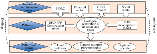 The implementation of market-oriented ecological restoration within territorial space aims to leverage market mechanisms to mobilize capital and direct it into project construction and development, thereby establishing a virtuous cycle of investment and returns that ultimately enhances the enthusiasm and confidence of social capital participants [43]. First, local governments can establish a comprehensive green finance system by issuing ecological restoration-specific bonds, green bonds, and other financial instruments and services to meet the substantial capital demands of such projects [44]. This promotes the integration of financial resources and ecological assets while enabling the design of appropriate incentive and constraint mechanisms to mitigate funding risks. Second, during the development and construction phase, models such as EPC (Engineering–Procurement–Construction), PPP (Public–Private Partnership), and EOD (Ecology-Oriented Development) should be actively promoted [45] to fully leverage the integrative capacity of social capital in terms of financing, construction, and operations, thereby alleviating financial and administrative pressure on local governments. Third, upon completion of ecological restoration, local governments and market entities should jointly develop policy documents and agreements outlining the allocation of responsibilities, risks, and future revenue streams. Mechanisms such as the trading of natural resource property rights—including carbon credits, water rights, and land development quotas—as well as concession sales [46], should be promoted to ensure an equitable distribution of benefits and obligations between the public and private sectors. Ultimately, these measures will contribute to the sustainable development of both the local ecological environment and economic systems (Figure 4).