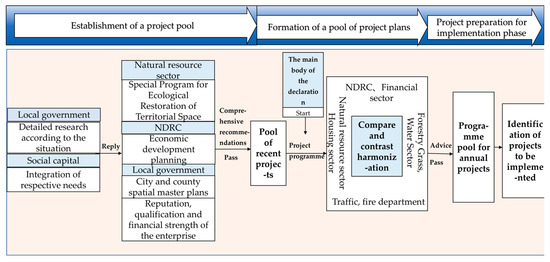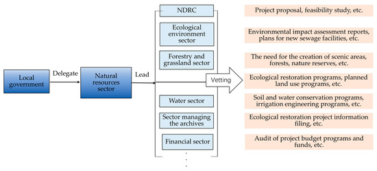 At the initial stage of ecological restoration projects, emphasis should be placed on the concept of resource management [51]. Simultaneously, it should prioritize comprehensive and integrated planning and management. Therefore, the approval and administration of market-oriented ecological restoration projects must clearly define the primary responsible authority and relevant departments. Following the institutional reform of China’s central government in 2018, the responsibility for ecological restoration has been transferred to the Ministry of Natural Resources [52]. Accordingly, local governments should designate the local natural resources department as the lead agency responsible for project implementation. This department should coordinate with other relevant agencies to conduct joint reviews and provide guidance based on the specific domains involved in each project. In line with local regulatory frameworks, the responsibilities of departments engaged in market-oriented ecological restoration must be explicitly defined—for instance, the Development and Reform Commission should oversee project proposal approvals, while the natural resources departments should be in charge of ecological restoration and land-use planning approvals. A robust organizational structure should be established, characterized by government leadership, interdepartmental coordination, upstream and downstream linkage, and collaborative governance. Furthermore, a comprehensive ecological protection and restoration plan should be developed, with clearly defined project objectives and tasks. Procedures for project submission and approval must be standardized, and mechanisms for property rights flow and confirmation should be optimized (Figure 6).