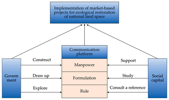 Effective coordination among diverse stakeholders is vital to the successful implementation of forest ecological restoration projects [58]. A central challenge in market-oriented restoration involves the interaction between government bodies and social capital, which can often be mitigated through well-structured communication mechanisms. Establishing a specialized communication platform tailored to market-oriented ecological restoration projects is recommended to enhance implementation efficiency [59]. Initially, government agencies should invest in training professionals with a solid understanding of market-based ecological restoration principles. Subsequently, the development of relevant policies and regulations should be expedited, accompanied by robust public outreach efforts to ensure that social capital entities fully understand and comply with the legal framework governing forest ecological restoration. Furthermore, standardized guidelines covering planning, design, engineering, governance evaluation, and financial management should be established to provide a scientifically grounded reference framework for social capital participation [60]. Ultimately, the communication platform will function as a key conduit for resolving conflicts and addressing challenges among stakeholders, thereby fostering effective collaboration between government entities and social capital to advance market-oriented forest ecological restoration initiatives (Figure 8).