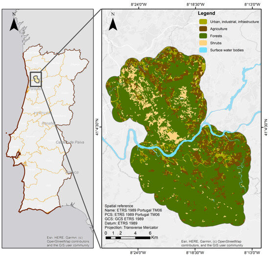 The research was conducted in Vale do Sousa, located in northwestern Portugal. It extends over an area of 28,940 ha, from which 14,320 ha corresponds to the Joint Management Areas (ZIF), separated by the Douro River. Elevation ranges from 20 to 710 m in the south and to 400 m in the north. Its topography is very uneven, and slopes can be very steep. This rural region has a Mediterranean climate with an Atlantic influence, and the soils present are mostly Umbric Leptosols and Leptic Regosols, developed over schist and granite bedrocks [35].
