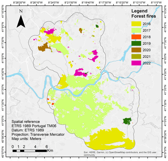 Forest fire perimeters (2016–2022) in the Vale do Sousa region, Portugal. Source: Instituto da Conservação da Natureza e das Florestas (ICNF).