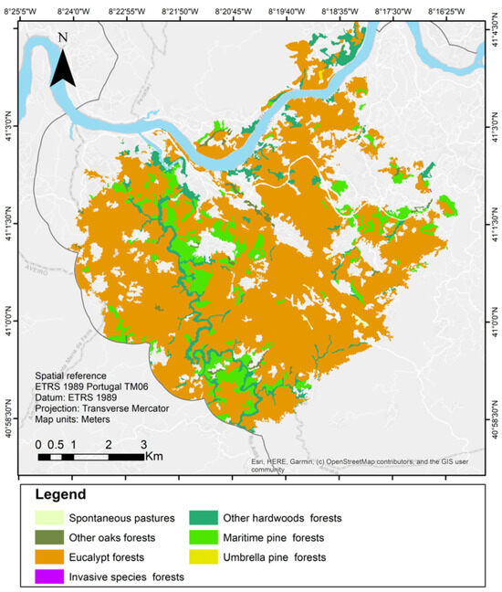 In the case study area, the land use composition following the EWE event was characterized by a predominance of forest stands (68.68%) (Figure 1). Within the forested landscape, eucalypt forests (Eucalyptus globulus Labill.) were the most prevalent, covering 53.79% of the total area and 80.34% of the forest area, followed by Maritime pine (Pinus pinaster Aiton.) forests, covering 11.06% of the forested area. Both species are used in commercial forestry. At a smaller scale, other forest species are also present.