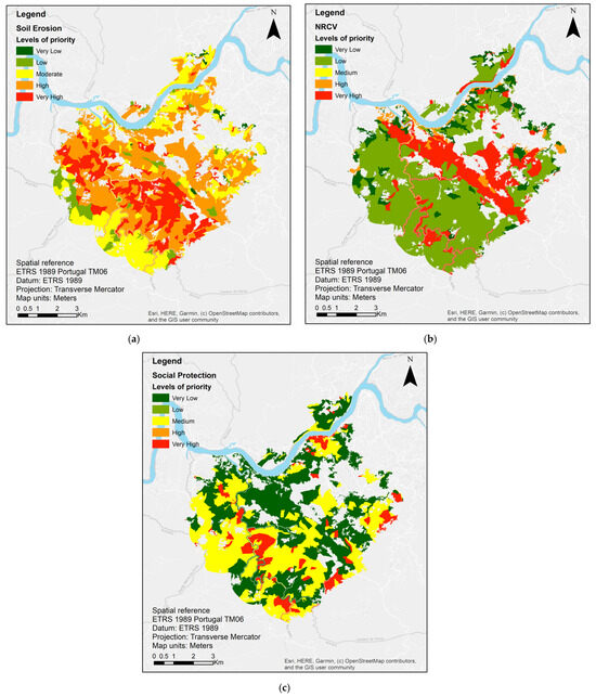 Prioritization maps listed as: (a) Soil Erosion (SE), (b) Natural Recovery Capacity of the Vegetation (NRCV), and (c) Social Protection (SE).