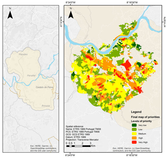 Wildfires have been very frequent in the three municipalities over which the Vale do Sousa landscape is distributed (Figure 2). In Portugal, 2017 ranked as the second warmest of the last two decades, marked by an extended drought, particularly a dry period from April to December, heightening the fire risk [36]. During this year, the total burned area in the study region reached 9700 ha (25.7% of the total area).