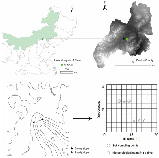 Location of the study area and sampling plots. Two 30 m × 30 m plots with different slope directions were evenly divided into 200 3 m × 3 m subplots, and soil samples and micro-meteorological data were obtained from each subplot.