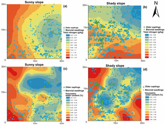 Spatial distribution patterns of TN and volumetric water content in regard to different slope aspects, estimated using an ordinary kriging method: (a) Soil total nitrogen on sunny slope; (b) Soil total nitrogen in shady slope; (c) Soil volumetric water content of sunny slope; (d) Soil volumetric water content of shady slope; Note: Maps show back-transformed kriging predictions in original units.