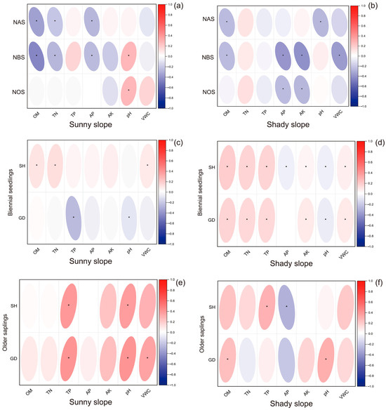 The correlation between seedlings and soil in regard to different slope directions: (a) NAS, NBS, NOS on sunny slope; (b) NAS, NBS, NOS on shady slope; (c) SH and GD of biennial seedlings on sunny slope; (d) SH and GD of biennial seedlings on shady slope; (e) SH and GD of older saplings on sunny slope; and (f) SH and GD of older saplings on shady slope. NAS, number of annual seedlings; NBS, number of biennial seedlings; NOS, number of older saplings; SH, seedling height; GD, ground diameter. The “*” represent p < 0.05.