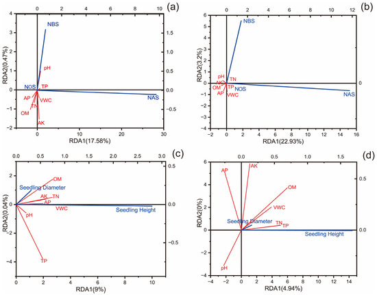 Redundancy analysis of seedlings and soil in regard to different slope directions: (a) sunny slope soil and the number of seedlings; (b) shady slope soil and the number of seedlings; (c) sunny slope soil and seedling height, ground diameter; and (d) shady slope soil and seedling height, ground diameter. NAS, number of annual seedlings; NBS, number of biennial seedlings; NOS, number of older saplings.