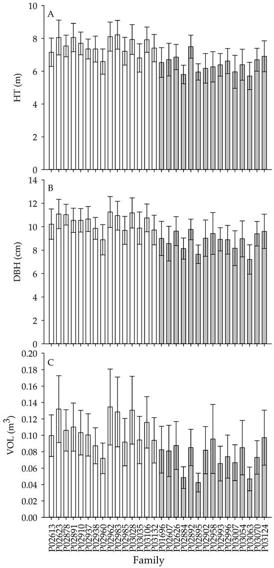Variations in tree height (HT) (A), diameter at breast height (DBH) (B), and volume (VOL) (C) of 30 full-sibs families of P. radiata. White bars = top-15 families; gray bars = bottom-15 families. Each bar represents average values for 30 families across three sites.