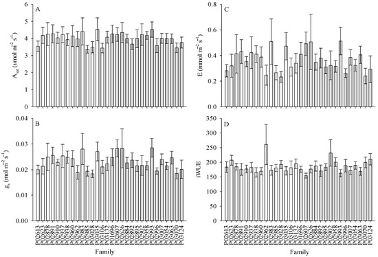 Variations in Asat (A), gs (B), E (C), and iWUE (D) of 30 full-sibs families of P. radiata. White bars = top-15 families; gray bars = bottom-15 families. Each bar represents average values for 30 families across the three sites.
