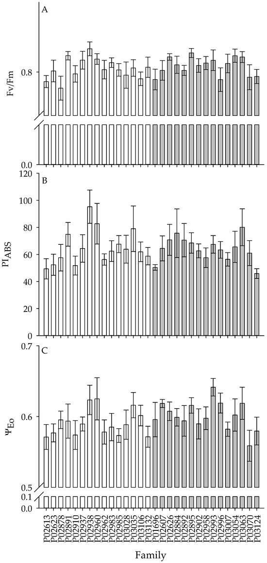 Variations in Fv/Fm (A), PIABS (B), and ψEo (C) of 30 full-sibs families of P. radiata. White bars = top-15 families; gray bars = bottom-15 families. Each bar represents average values for 30 families across three sites.
