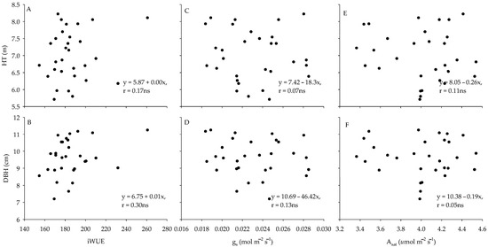 Relationships among HT with iWUE (A), gs (C) and Asat (E), and among DBH with (iWUE (B), gs (D) and Asat (F)). Each data point represents average values for 30 families across the three sites. In the inset equation of each panel, ns means ”statistically non- significant”.