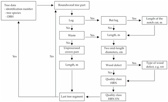 To determine the quantity and quality of the produced log assortments, a destructive method was used. Tree bucking was performed based on the wood’s potential for its end use in the wood industry following HRN standard [45,46,47], which is in use by »Croatian Forests« Ltd. Following minimal dimensions and allowed wood defects prescribed by the used standard, produced logs were classified as veneer logs of the first quality class (VLI), and second quality class (VLII) [45], saw logs of the first quality class (SLI), second quality class (SLII), and third quality class (SLIII) [46], and fuel wood (FW) [47]. Additionally, quality classes were assigned following HRN EN 1316-1 standard grades [48], which classify produced round wood based on its quality into following classes: A, B, C, D, and FW (where A is the best quality class and D is the worst quality class).